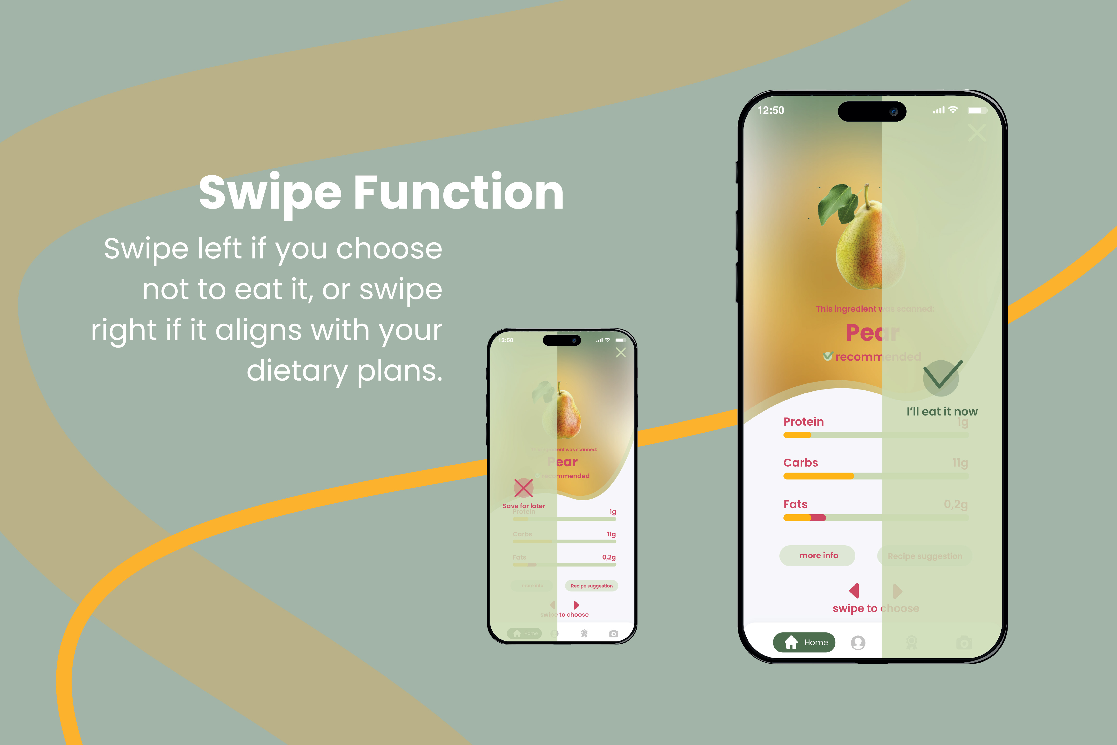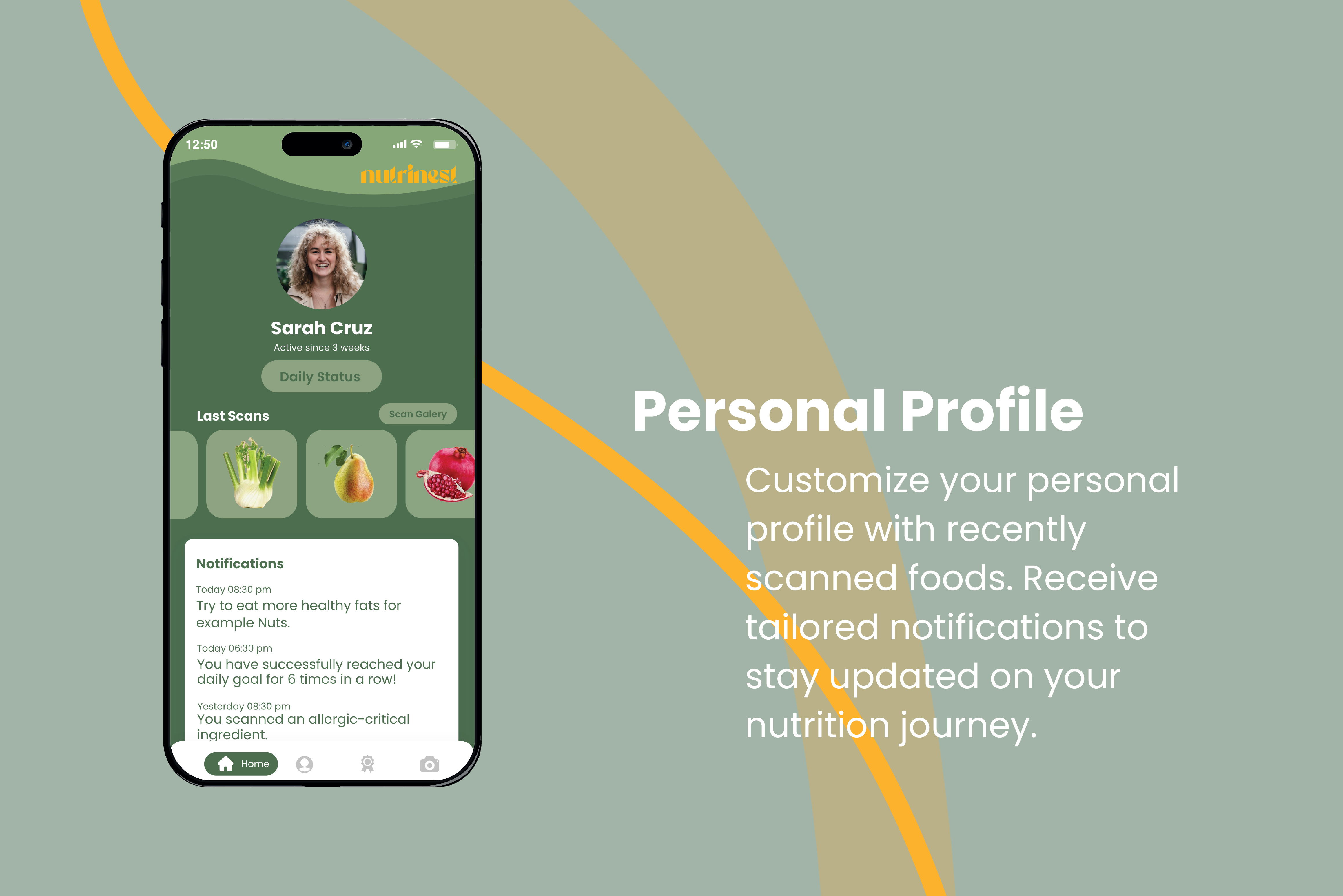 Nutrinest is the concept of an augmented reality app designed to support users in maintaining a healthy and balanced diet. Its core feature, Smart Tracking, recognises and records ingredients inlive mode, providing real-time insights. In addition, the app delivers detailed information on allscanned foods and suggests personalised recipes based on recently detected ingredients. Personal health requirements and individual nutritional goals remain at the centre of the experience. Comprehensive statistics and a personal profile help users keep track of relevant data andmonitor their progress. A gallery of all recorded ingredients visualises the user’s dietary journeyand appeals to their collecting and playful instincts. Through daily goals and interactive motivation,Nutrinest encourages long-term engagement and promotes a more conscious approach tonutrition.