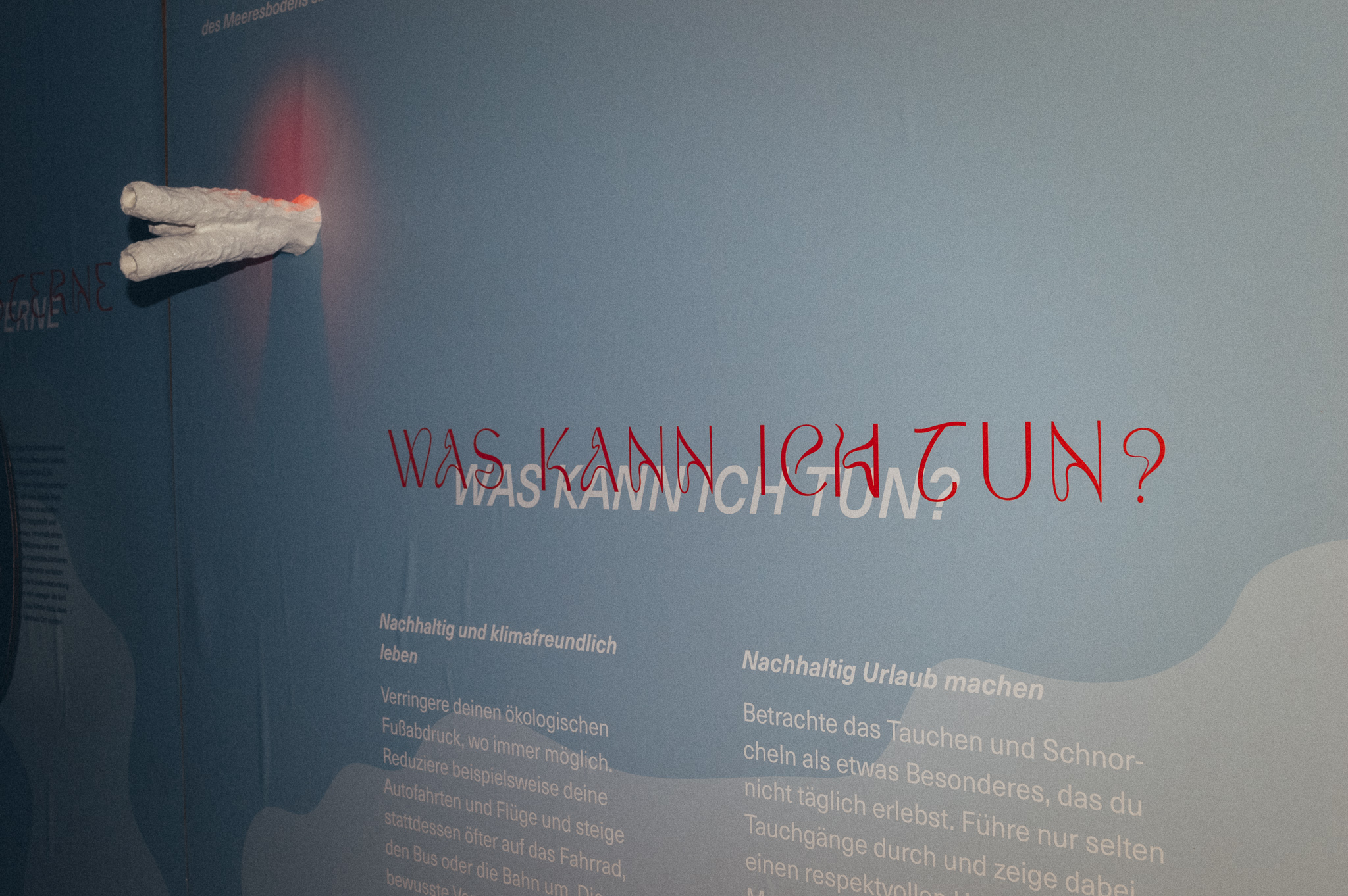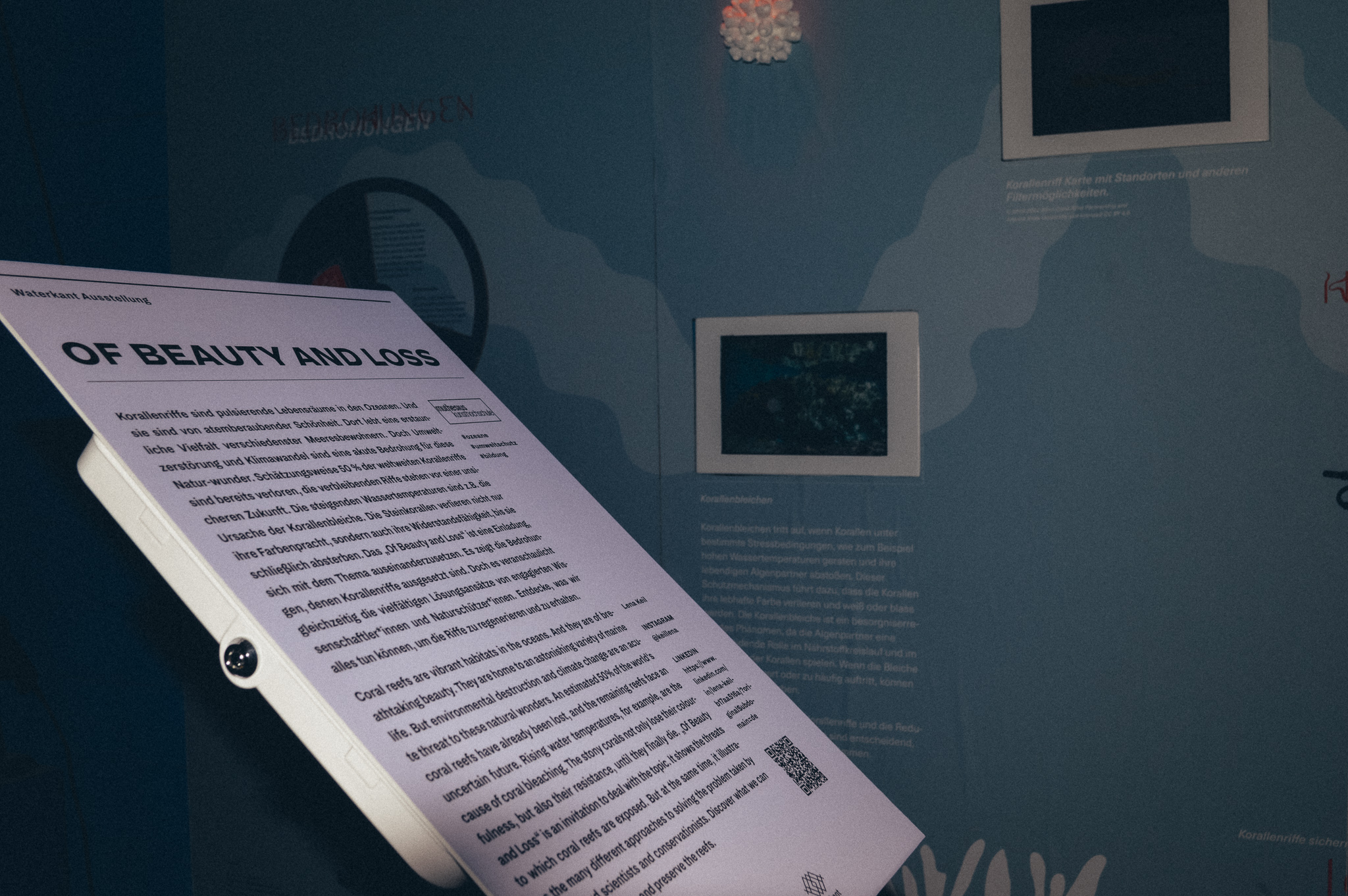In den Tiefen der Ozeane erstrecken sich Korallenriffe als pulsierende Lebensgemeinschaften aus Korallen und einer erstaunlichen Vielfalt mariner Lebewesen. Die Fülle an Farben, Bewegung und geschäftigem Treiben macht diese Riffe zu einem wahren Wunder der Natur. Leider hat diese atemberaubende Schönheit ihren Preis. Korallenriffe sind akut bedroht: Etwa 50 % der weltweiten Korallenriffe sind bereits verloren gegangen, und die verbleibenden Riffe stehen vor einer ungewissen Zukunft. Der Klimawandel zählt zu den größten Gefahren für diese Ökosysteme. Steigende Wassertemperaturen führen zur Korallenbleiche, bei der Korallen ihre symbiotischen Algen verlieren und in einem gebleichten Zustand zurückbleiben. Dies schwächt ihre Widerstandskraft und macht sie anfällig für Krankheiten und weitere Stressfaktoren. Doch der Klimawandel ist nicht die einzige Bedrohung. „Of Beauty and Loss“ lädt dazu ein, sich intensiver mit diesem Thema auseinanderzusetzen, mehr über die Gefahren für Korallenriffe zu erfahren und die dringende Notwendigkeit von Schutzmaßnahmen zu erkennen. Gleichzeitig zeigt die Ausstellung Hoffnung – in den Lösungsansätzen von Wissenschaftler:innen und Naturschützer:innen. Von der Entwicklung von Korallenklonen über die Einrichtung von Meeresschutzgebieten bis hin zu nachhaltigen Fischereipraktiken gibt es konkrete Maßnahmen, um die Riffe zu erhalten und ihre Regeneration zu unterstützen. Was wäre, wenn? Was wäre, wenn wir handeln? Was wäre, wenn wir uns gemeinsam dem Schutz der Korallenriffe verschreiben? Die Antwort macht Hoffnung. Durch bewusste Entscheidungen, die Reflexion unseres Konsumverhaltens, die Unterstützung nachhaltiger Praktiken und den Einsatz für den Schutz der Riffe können wir einen Unterschied machen. Gemeinsam können wir die fragile Schönheit dieser beeindruckenden Ökosysteme bewahren und sicherstellen, dass auch zukünftige Generationen ihre Bedeutung und Faszination erleben können.